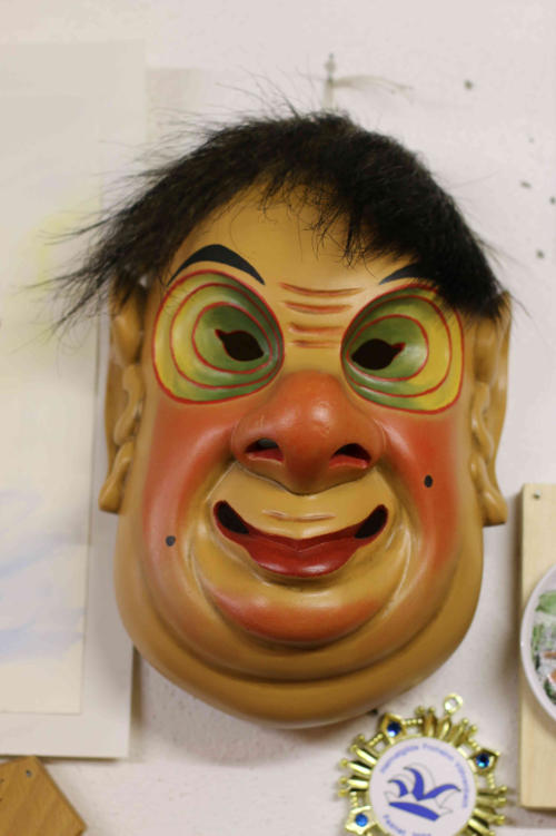 An den Wänden befinden sich unbemalte Masken mit ganz verschiedenen äusseren